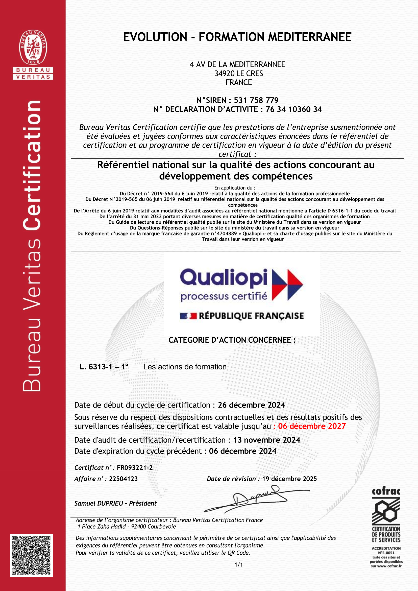 Le Certificat Qualiopi nous a été délivrée le 7 décembre 2021 au titre de la catégorie d'action suivante: Actions de Formation